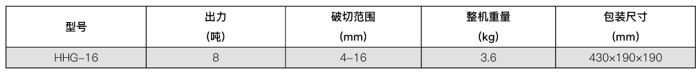 手动液压钢筋剪 型号:HHG-16 特点介绍: 适合剪切Ø4-16 mm钢筋。 开口式刀头设计,使用方便。 高强度特殊钢剪切刀片。 钢制外壳和手柄,坚固耐用。 切割完成后,旋转泄压阀即可完成复位。 塑料便携箱包装。 参数: 分类: 手动液压钢筋剪2018年11月21日文章导航历史的文章历史的文章:手动液压钢筋剪HHG-10未来的文章未来的文章:手动液压钢筋剪HHG-20相关文章手动液压钢筋剪HHG-222018年11月21日手动液压钢筋剪HHG-202018年11月21日手动液压钢筋剪HHG-102018年11月21日