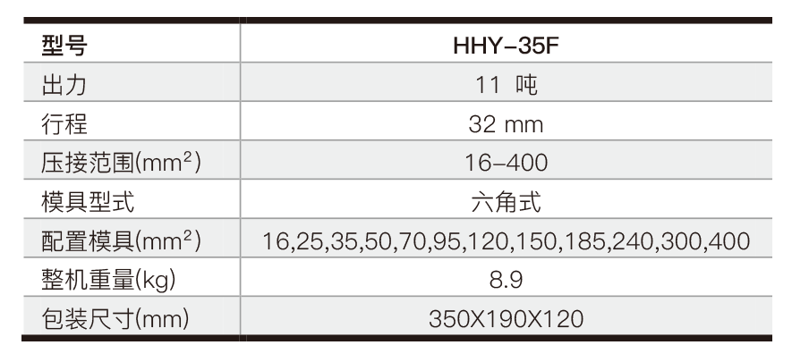 分体式液压压接钳 型号:HHY-35F 特点介绍: C型紧凑工作头,可旋转,适合狭小空间内工作。 配置R2 3/8快速接头和防尘帽。 可连接任何输出压力达700 bar (10,000 psi)的液压泵。 钢制便携箱包装,储放工具和配件。 参数: 分类: 分体式液压钳2018年11月26日文章导航历史的文章历史的文章:台式液压压接钳,HHYF-240F,HHYF-400F未来的文章未来的文章:分体式液压压接钳,HHY-300F相关文章分体式液压压接钳,HHY-200T2018年11月27日分体式液压压接钳,HHY-100TF2018年11月27日分体式液压压接钳,HHY-60T2018年11月27日分体式液压压接钳,HHY-630F2018年11月27日分体式液压压接钳,HHY-1000F2018年11月27日分体式多功能全能王,HHY-60HF2018年11月26日
