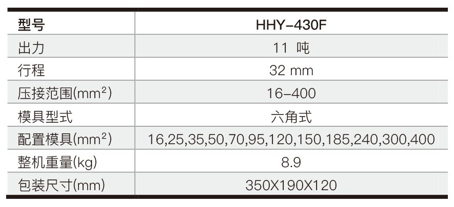 分体式液压压接钳 型号:HHY-430F 特点介绍: C型大工作头,可旋转,压接范围达400mm²。 配置R2 3/8快速接头和防尘帽。 可连接任何输出压力达700 bar (10,000 psi)的液压泵。 钢制便携箱包装,储放工具和配件。 参数: 分类: 分体式液压钳2018年11月26日文章导航历史的文章历史的文章:分体式液压压接钳,HHY-400F未来的文章未来的文章:分体式液压压接钳,HHY-510F相关文章分体式液压压接钳,HHY-200T2018年11月27日分体式液压压接钳,HHY-100TF2018年11月27日分体式液压压接钳,HHY-60T2018年11月27日分体式液压压接钳,HHY-630F2018年11月27日分体式液压压接钳,HHY-1000F2018年11月27日分体式多功能全能王,HHY-60HF2018年11月26日