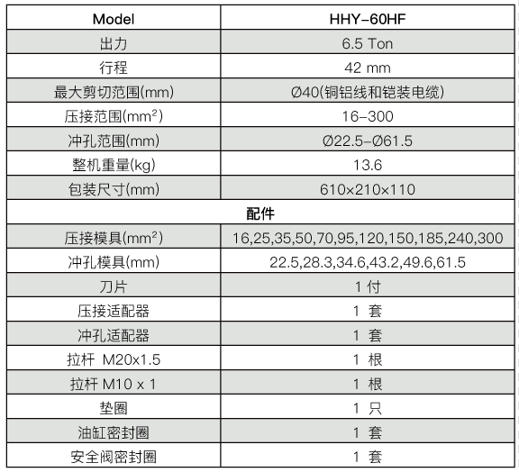分体式多功能全能王 型号:HHY-60HF 特点介绍: 翻开式三合一多功能工作头,可旋转350°。 配置R2 3/8快速接头和防尘帽。 用于在700br工作压力下与液压泵连接以获得最好的压接、剪切与冲孔效果。 参数: 分类: 分体式液压钳2018年11月26日文章导航历史的文章历史的文章:分体式液压压接钳,HHY-510F未来的文章未来的文章:分体式液压压接钳,HHY-1000F相关文章分体式液压压接钳,HHY-200T2018年11月27日分体式液压压接钳,HHY-100TF2018年11月27日分体式液压压接钳,HHY-60T2018年11月27日分体式液压压接钳,HHY-630F2018年11月27日分体式液压压接钳,HHY-1000F2018年11月27日分体式液压压接钳,HHY-510F2018年11月26日