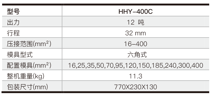手动液压压接钳 型号:HHY-400C 特点介绍: 钢制外壳和手柄,坚固耐用。 C型开口工具头,钳头可旋转。 采用两段式液压设计,保证用较少的力即可快速完成压接。 内置过载保护的压力安全阀。 旋转泄压阀即可完成复位。 塑料便携箱包装,储放工具和配件。 参数: 分类: 手动液压钳2018年11月27日文章导航历史的文章历史的文章:手动液压压接钳,HHY-300D未来的文章未来的文章:手动液压压接钳,HHY-400B相关文章手动多功能全能王,HHY-60H2018年11月27日手动液压压接钳,HHY-400E2018年11月27日手动液压压接钳,HHY-400D2018年11月27日手动液压压接钳,HHY-300G2018年11月27日手动液压压接钳,HHY-5102018年11月27日手动液压压接钳, HHY-4302018年11月27日