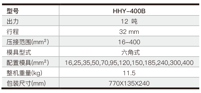 手动液压压接钳 型号:HHY-400B 特点介绍: 钢制外壳和手柄,坚固耐用。 C型开口工具头,钳头可旋转。 采用两段式液压设计,保证用较少的力即可快速完成压接。 内置过载保护的压力安全阀。 旋转泄压阀即可完成复位。 塑料便携箱包装,储放工具和配件。 参数: 分类: 手动液压钳2018年11月27日文章导航历史的文章历史的文章:手动液压压接钳,HHY-400C未来的文章未来的文章:手动液压压接钳,HHY-400相关文章手动多功能全能王,HHY-60H2018年11月27日手动液压压接钳,HHY-400E2018年11月27日手动液压压接钳,HHY-400D2018年11月27日手动液压压接钳,HHY-300G2018年11月27日手动液压压接钳,HHY-5102018年11月27日手动液压压接钳, HHY-4302018年11月27日
