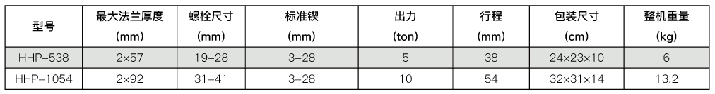 分体式液压法兰分离器 型号:HHP-538,HHP-1054 特点介绍: 分体式液压设计,轻便使用。 70-216mm的可调尖端宽度,应用范围广。 单作用,弹簧复位。 配置R2 3/8快速接头和防尘帽。 可连接任何输出压力达700bar的液压泵。 参数: 分类: 液压式法兰分离器2018年11月27日文章导航历史的文章历史的文章:充电式液压螺帽破切器,HHYD-24B未来的文章未来的文章:机械式法兰分离器,HHP-8相关文章整体式液压法兰分离器,HHP-102018年11月27日分体式液压法兰分离器, HHP-14812018年11月27日
